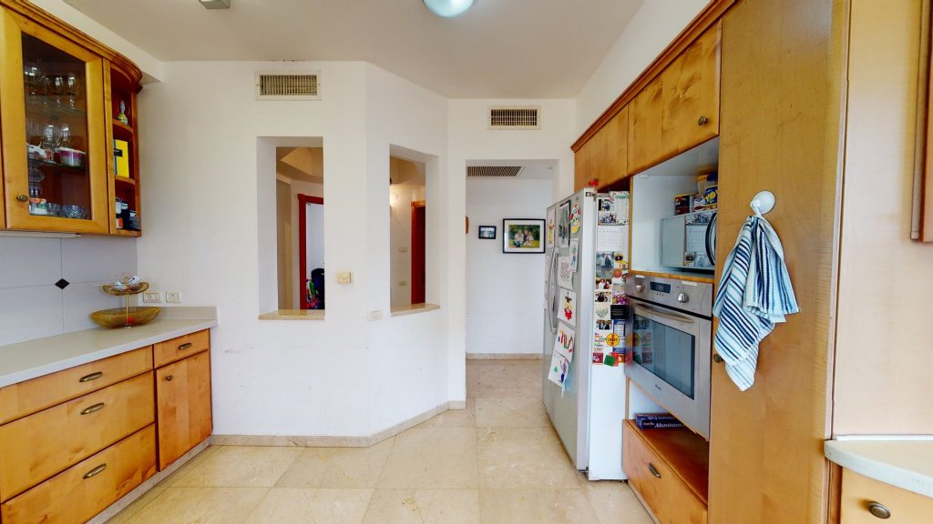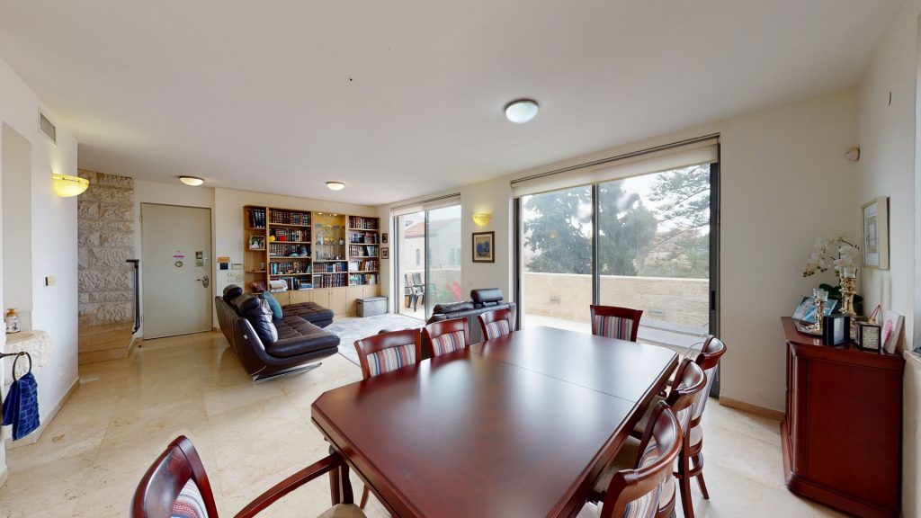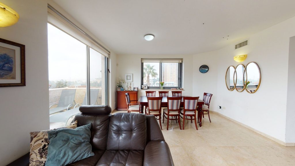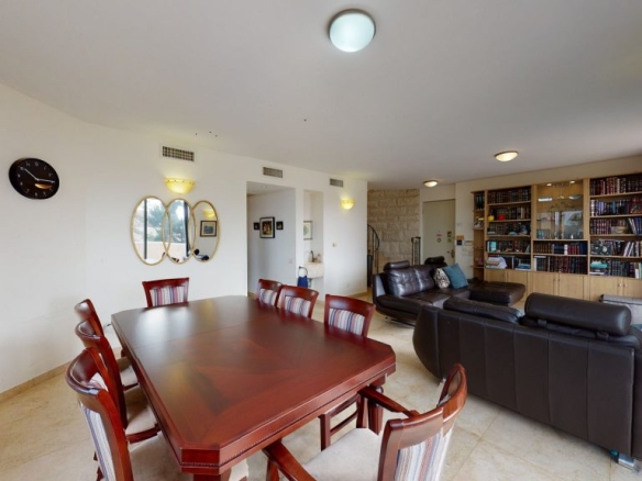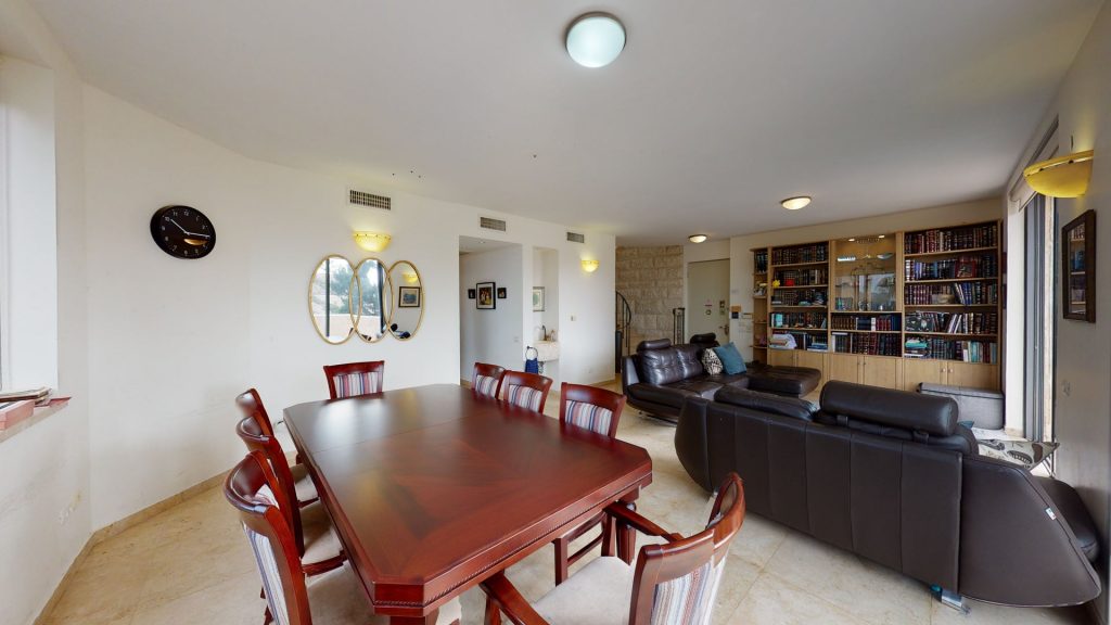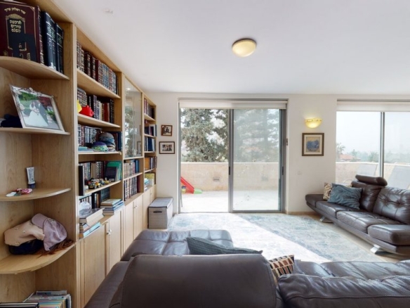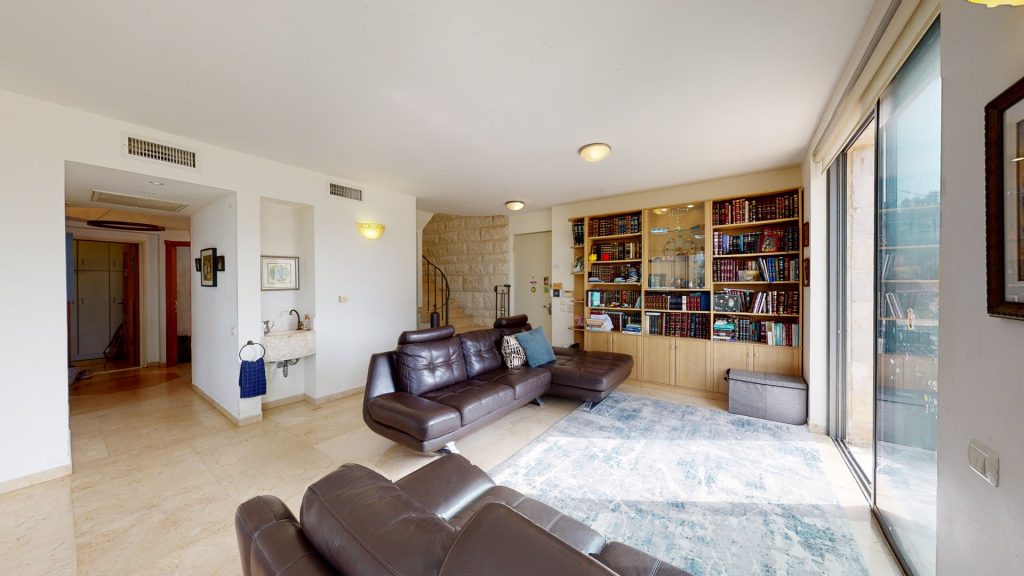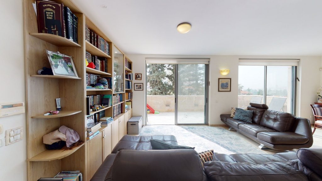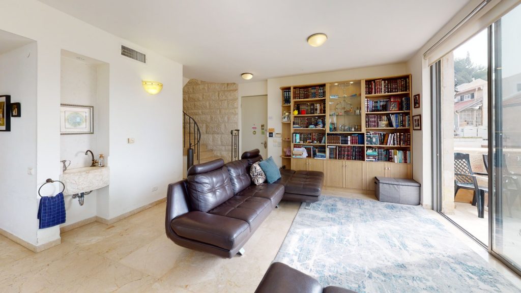On the entrance level there is a spacious living room with an exit to a large 17 Sqm. sukkah balcony with a panoramic view. Modern kitchen and dinning area. A Bedroom leading to another sukkah balcony, and a half room (Can be a Passover kitchen / storage /office).