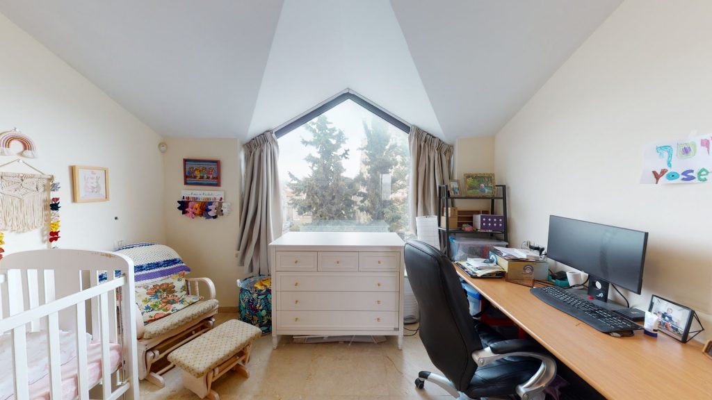 The second floor consists of 2 large bedrooms with high ceilings and a beautiful view . In addition there is a spacious master suite + sukkah balcony.