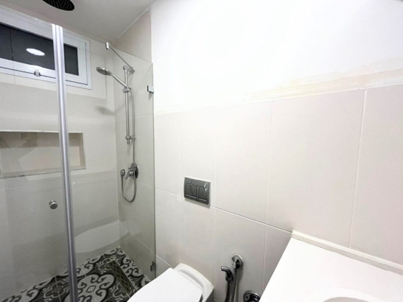 This is a unique and renovated apartment, with a private entrance (with stairs), 100 SQM built, 2 bedrooms, 2.5 bathrooms. There is an additional 210 SQM of outdoor space with spectacular views of the green neighborhood. The apartment has an open-plan kitchen, living room, 2 master units with en-suite bathrooms, and another guest toilet. The front garden is 150 SQM and there is a 10 SQM balcony off of the living room. In addition, there is a 50 SQM rear garden surrounded by greenery. There is central AC and underfloor heating.