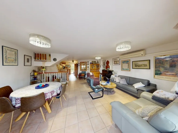 - Entry level: spacious living room, dining area, kitchen, guest bathroom, and access to a large terrace