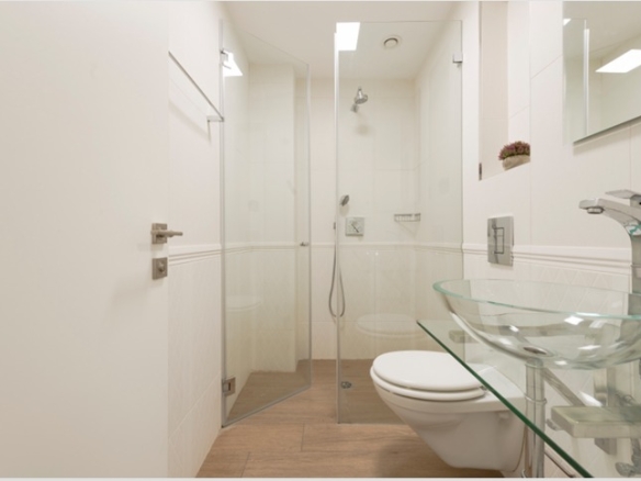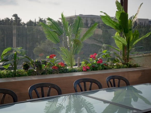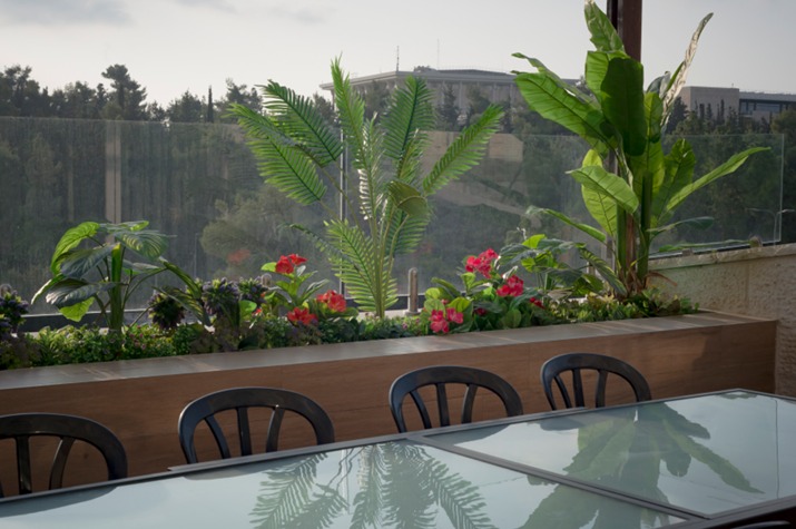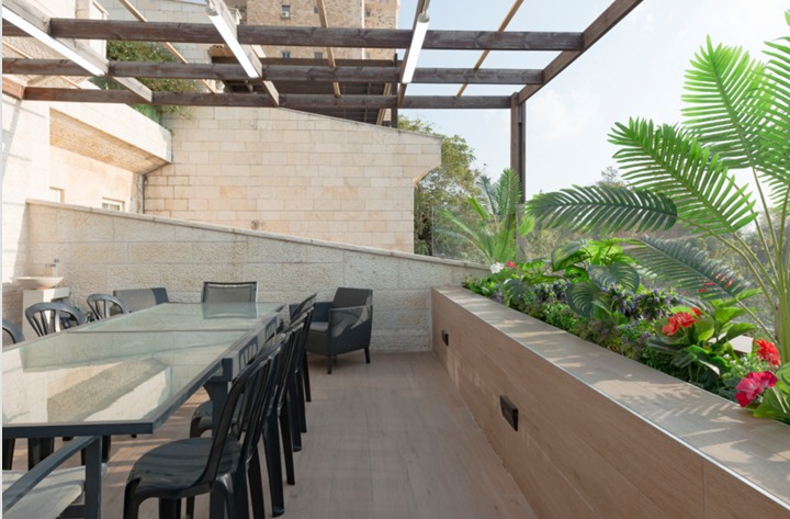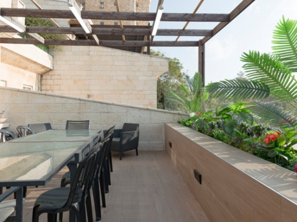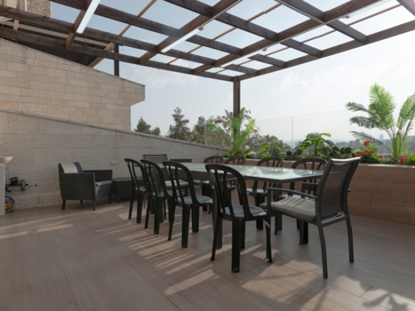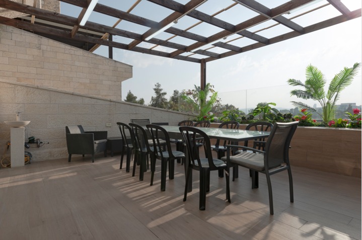 There are 5 bedroom and 4 full bathrooms, including two master bedrooms with full bathrooms. A modern open-plan kitchen, fully equipped, and with a large “island” maximizing the space. The kitchen is open to the living room/dining area. At the end of the large lounge/dining room, a charming view awaits, overlooking the wooded, green, famous Gan Saker park, the majestic Knesset building and other classic Jerusalem views. When you exit the living room through the patio doors, this view can be enjoyed first-hand. The 25 sqm balcony is perfect for a large sukkah or for just wining and dining on whilst taking in the view.