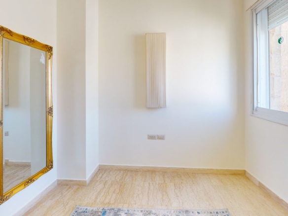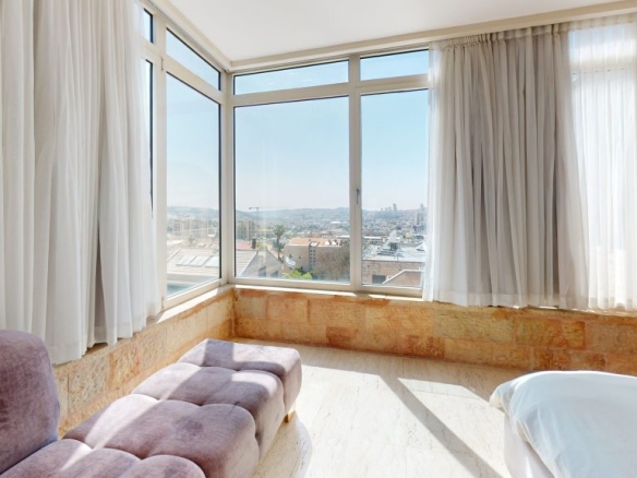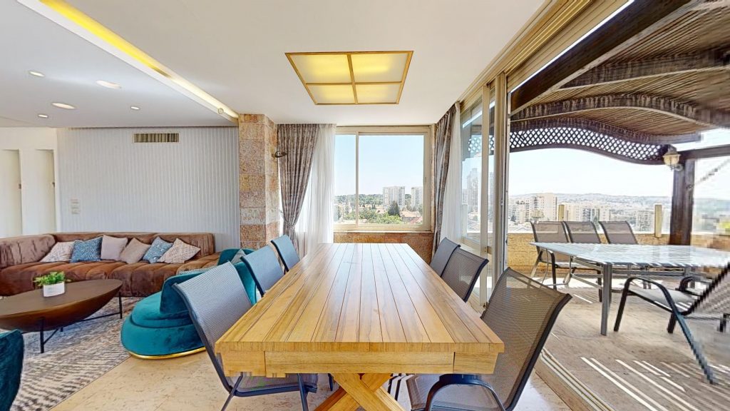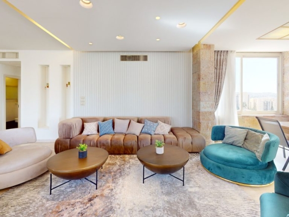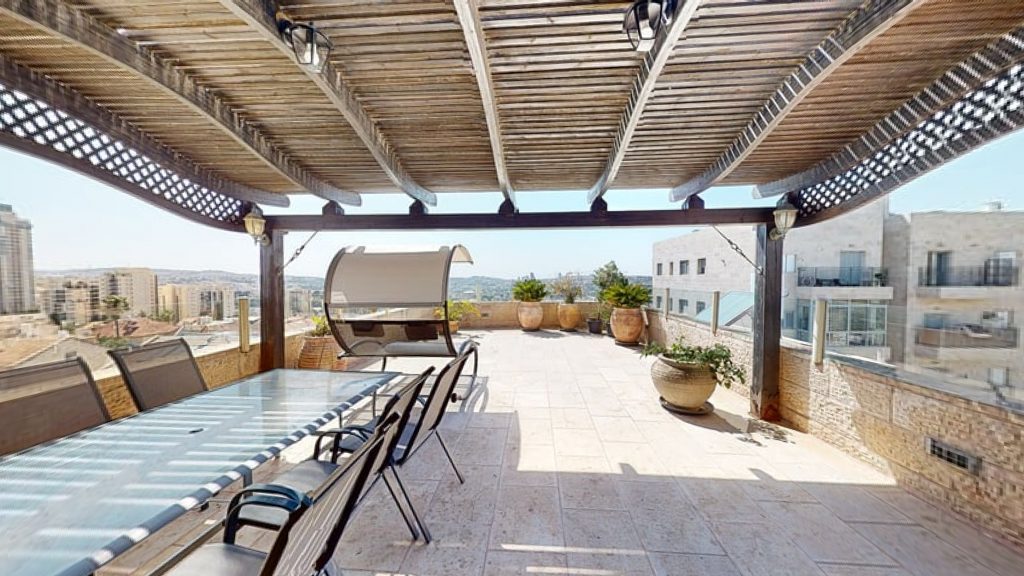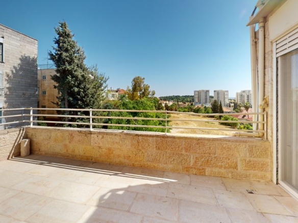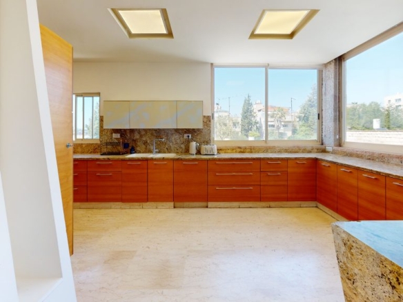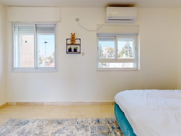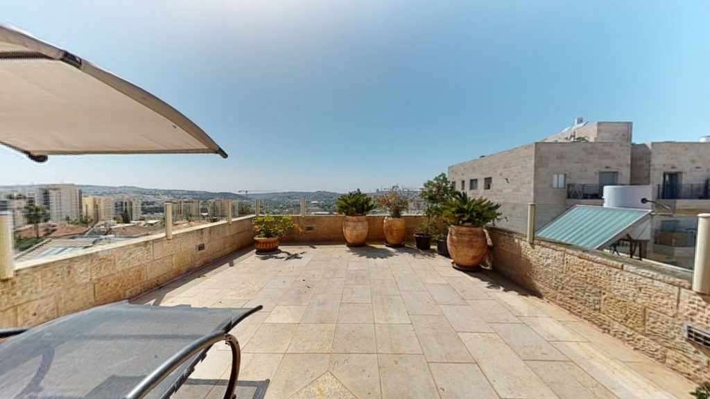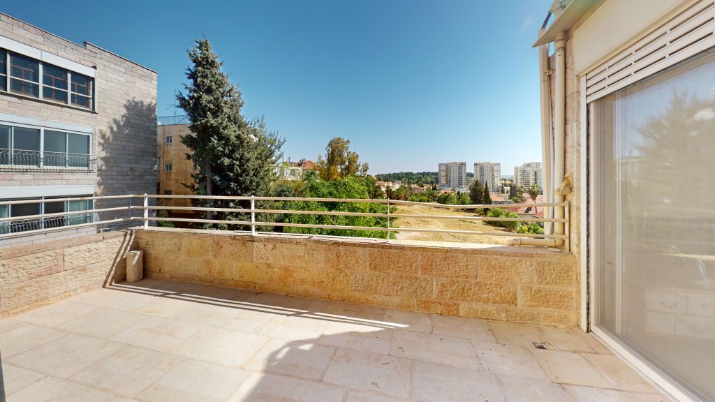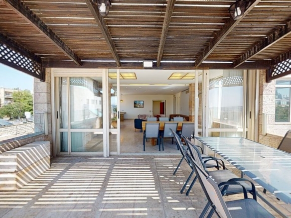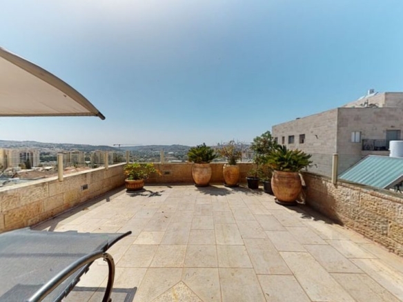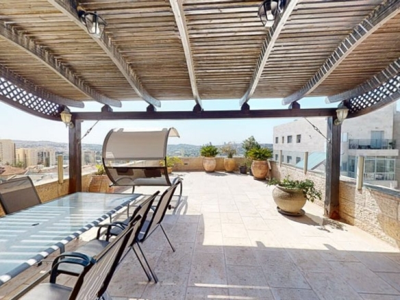 This is a beautiful 200 SQM penthouse on the quiet Beit Ha’arava Street in Arnona. On the fourth floor with direct and private elevator access to the apartment. This home is built all on one level, the whole top floor of the building. There are 4 bedrooms, 2.5 bathrooms, a 5 sqm private storage room, and 2 sukkah balconies,(50sqm + 15sqm), with beautiful panoramic views. The house is full of natural light, and fresh air, with amazing views of the Jerusalem hills. The apartment is in great condition, and has electric underfloor heating, central air conditioning in the living room and units in the bedrooms. There is 1 covered parking space. The furniture can be purchased with the apartment.