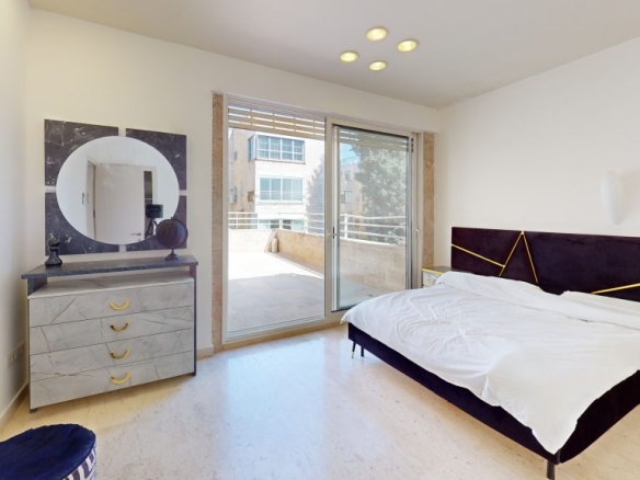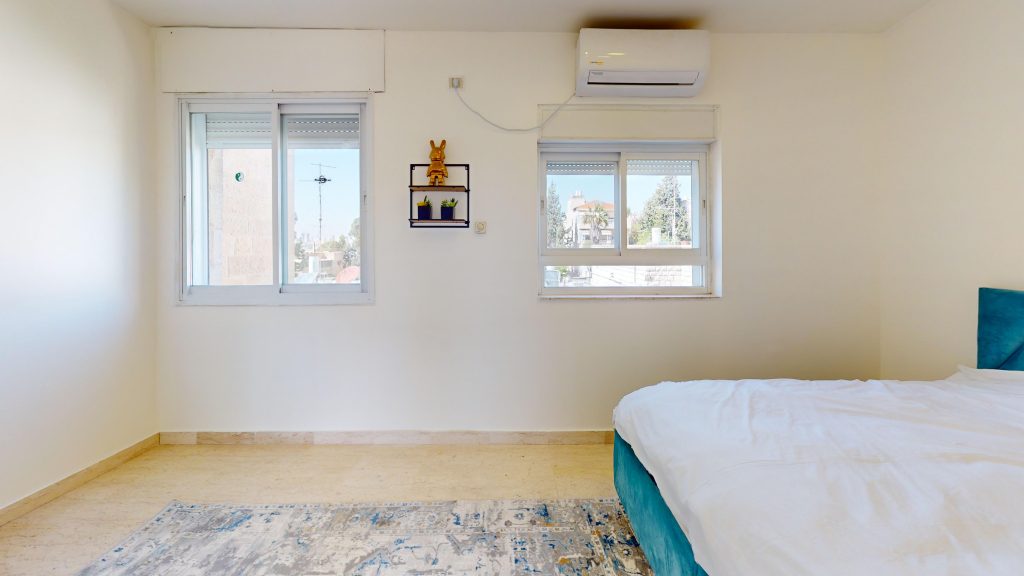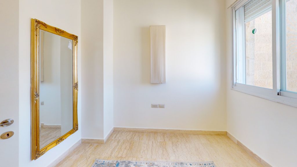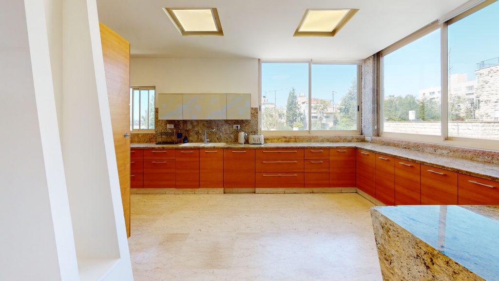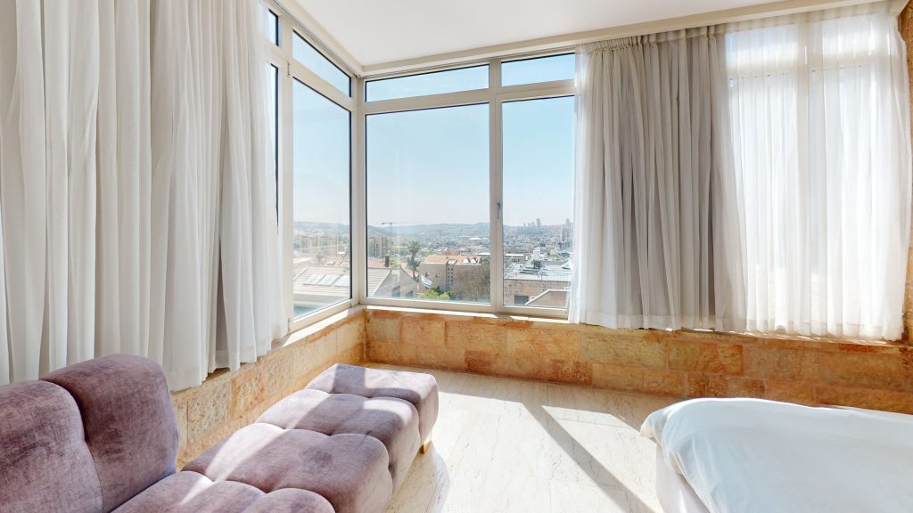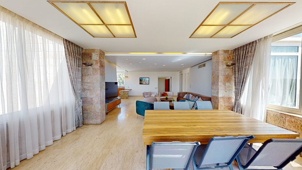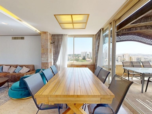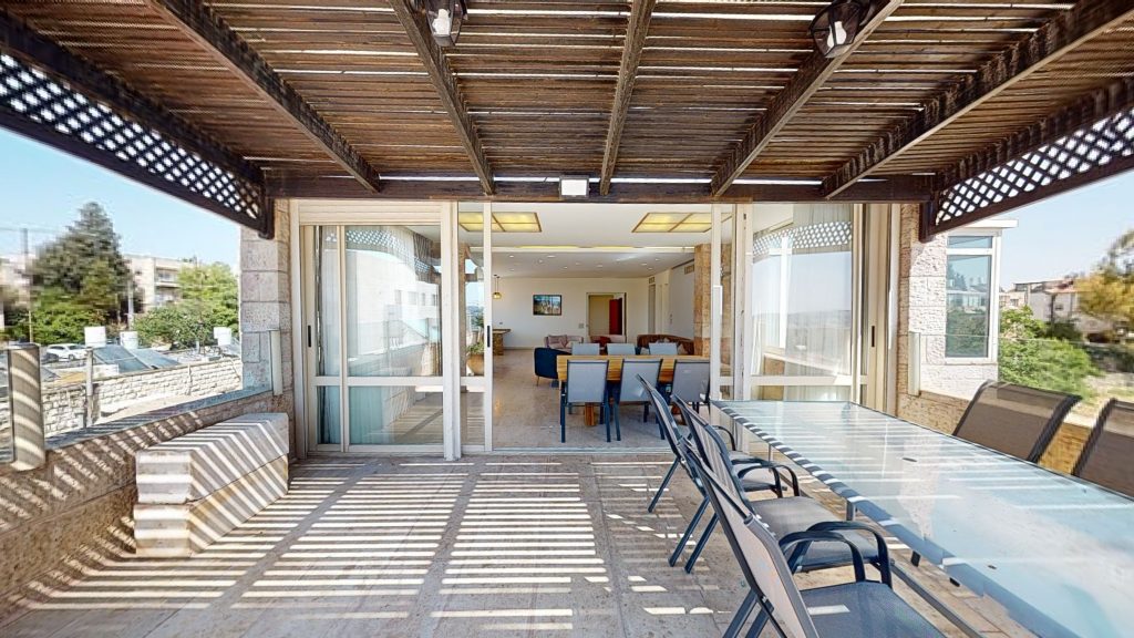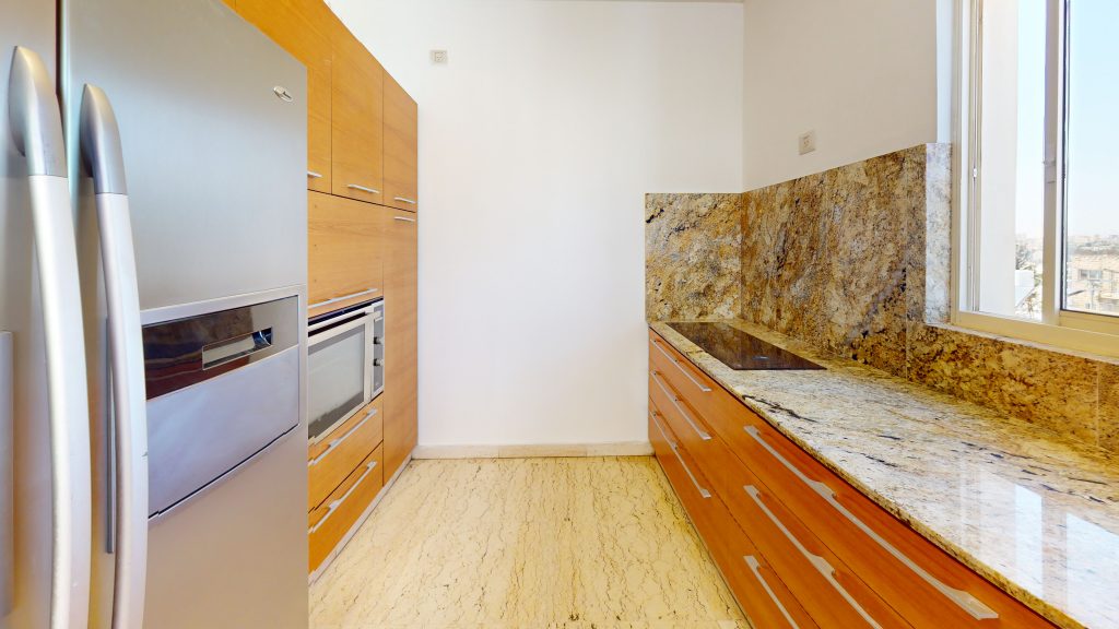 This is a beautiful 200 SQM penthouse on the quiet Beit Ha’arava Street in Arnona. On the fourth floor with direct and private elevator access to the apartment. This home is built all on one level, the whole top floor of the building. There are 4 bedrooms, 2.5 bathrooms, a 5 sqm private storage room, and 2 sukkah balconies,(50sqm + 15sqm), with beautiful panoramic views. The house is full of natural light, and fresh air, with amazing views of the Jerusalem hills. The apartment is in great condition, and has electric underfloor heating, central air conditioning in the living room and units in the bedrooms. There is 1 covered parking space. The furniture can be purchased with the apartment.