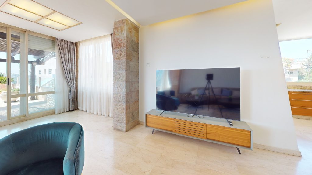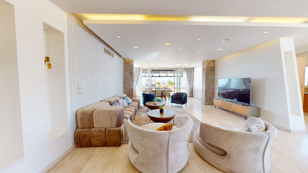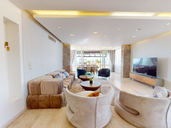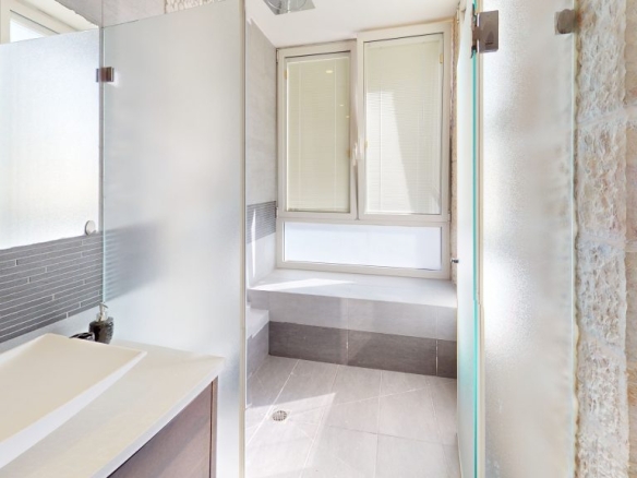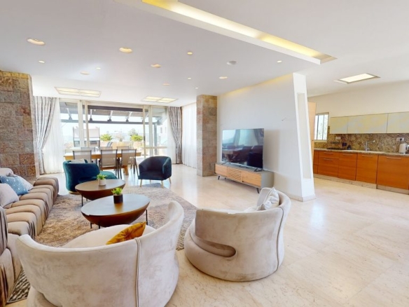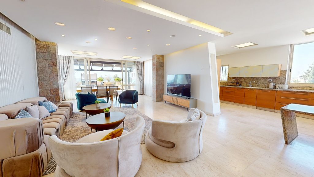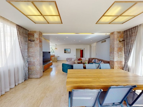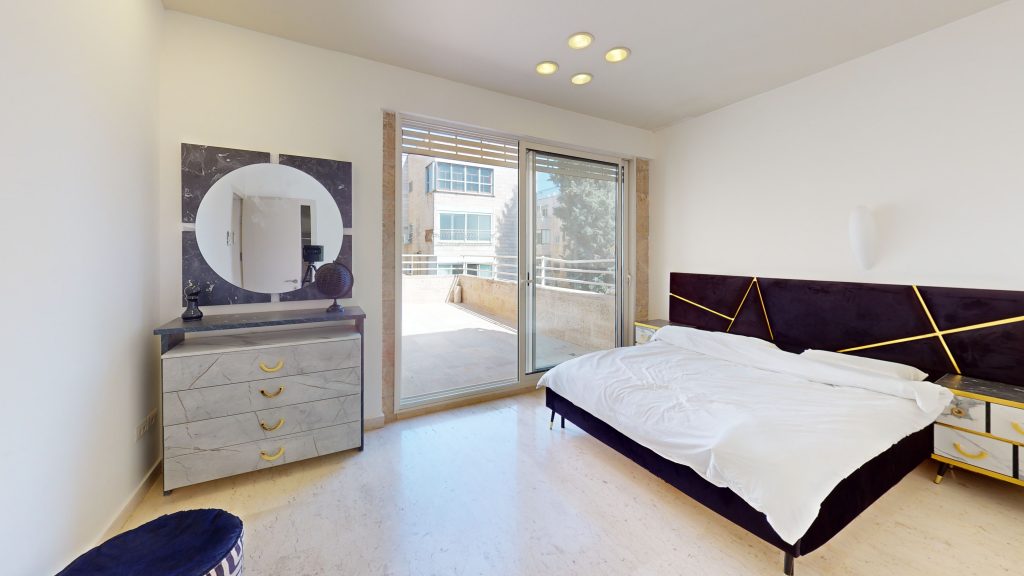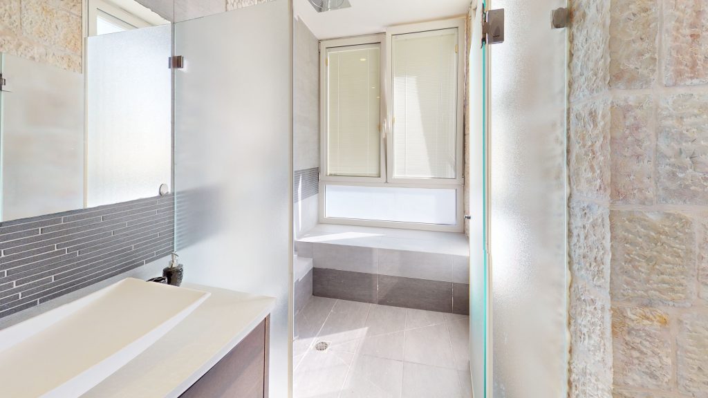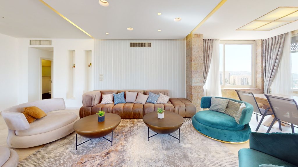 This is a beautiful 200 SQM penthouse on the quiet Beit Ha’arava Street in Arnona. On the fourth floor with direct and private elevator access to the apartment. This home is built all on one level, the whole top floor of the building. There are 4 bedrooms, 2.5 bathrooms, a 5 sqm private storage room, and 2 sukkah balconies,(50sqm + 15sqm), with beautiful panoramic views. The house is full of natural light, and fresh air, with amazing views of the Jerusalem hills. The apartment is in great condition, and has electric underfloor heating, central air conditioning in the living room and units in the bedrooms. There is 1 covered parking space. The furniture can be purchased with the apartment.