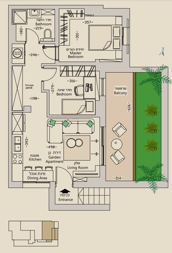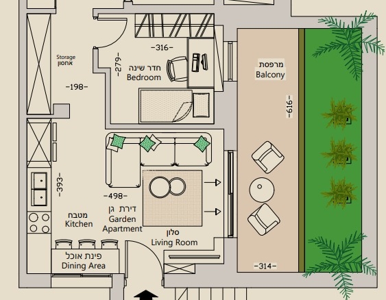 A well-planned garden apartment, 61 sqm, with 2 bedrooms, 1 full bathroom, and 35 sqm balcony & garden.