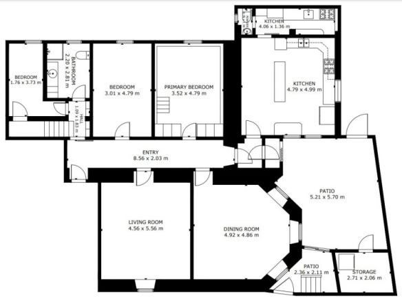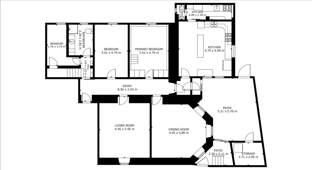 It has 2 private entrances, a beautiful yard, a storage room, and an attached roof.