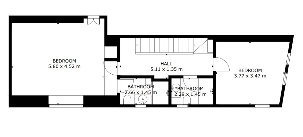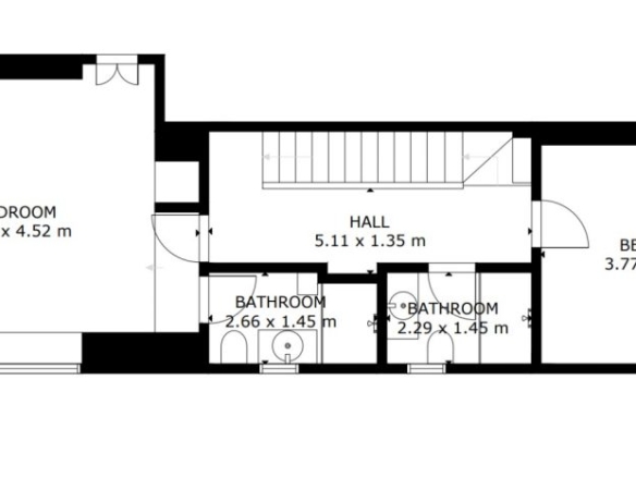 Upstairs, there are 2 spacious bedrooms, one of which is a master bedroom with en-suite bathroom, and another central bathroom.