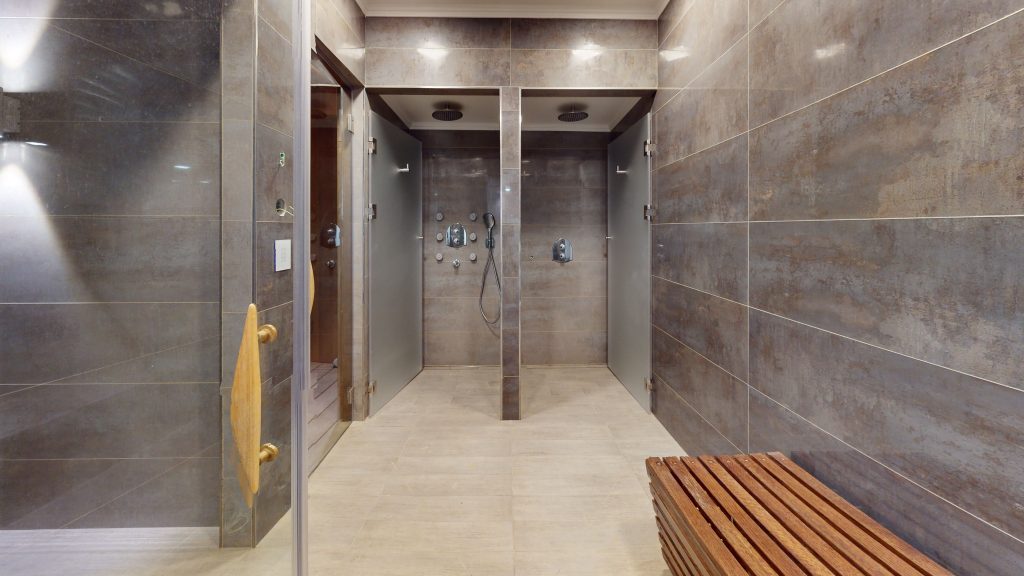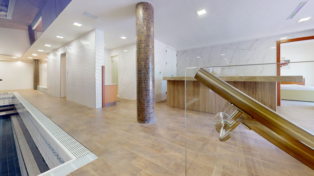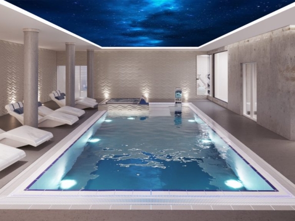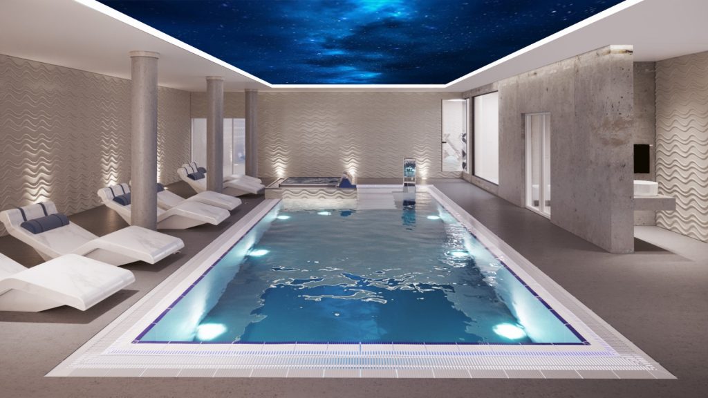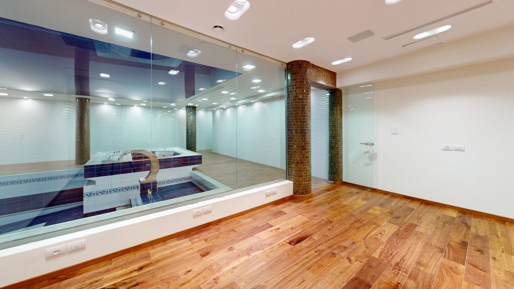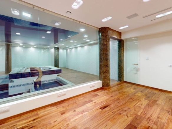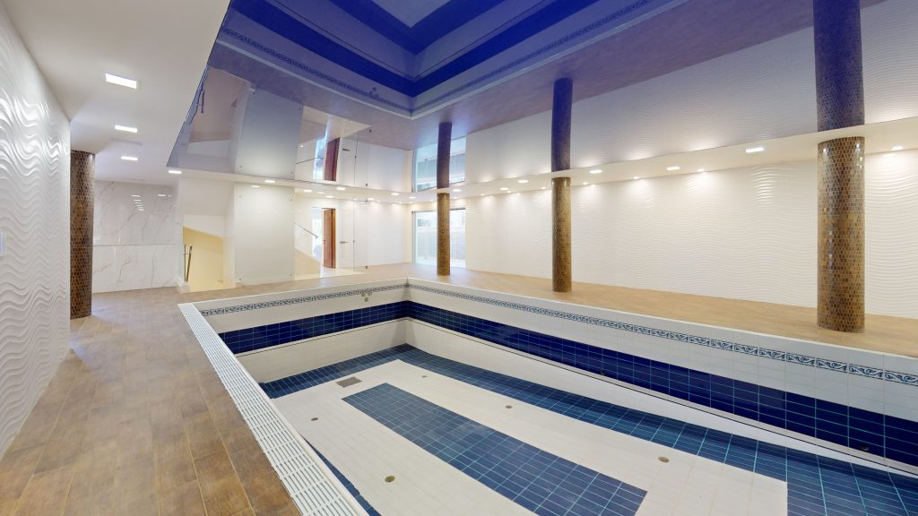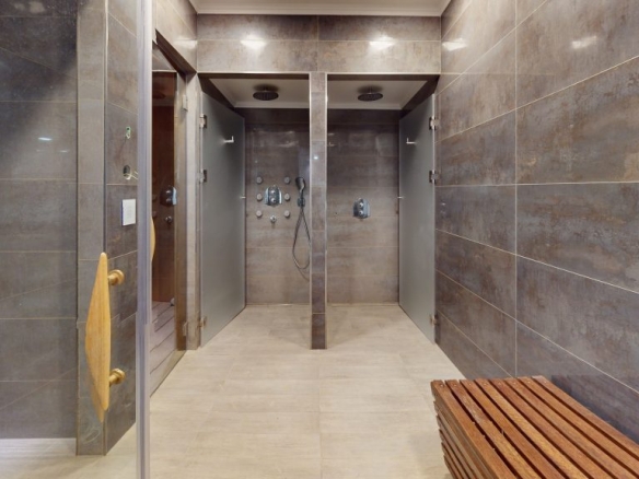 The ‘Entertainment Level’ (about 300 SQM) offers a heated pool, built-in jacuzzi, gym, wet and dry saunas, bar, treatment room, and an exit to a courtyard (123 SQM).