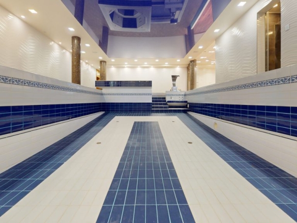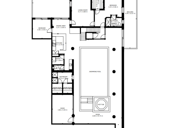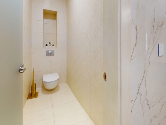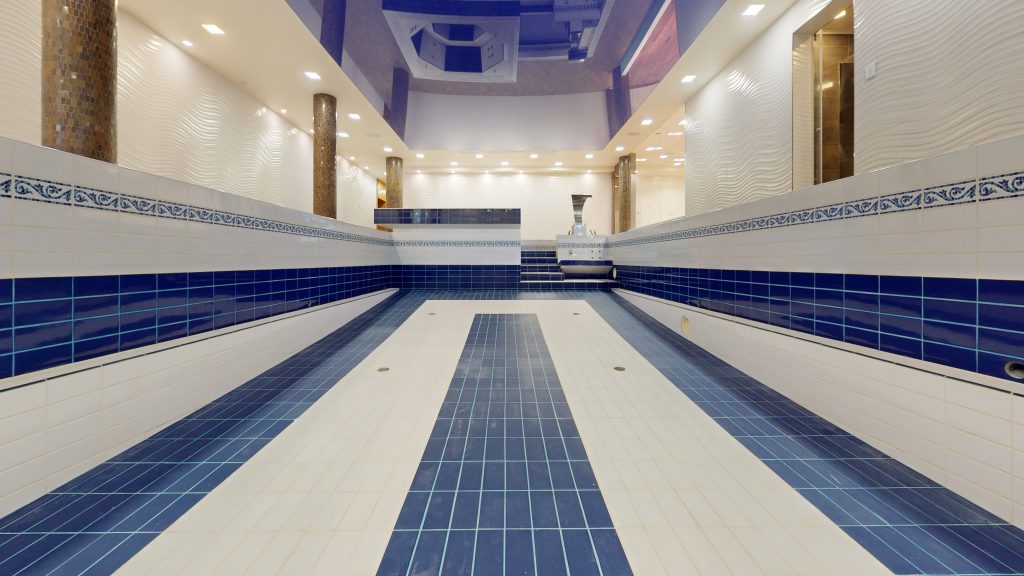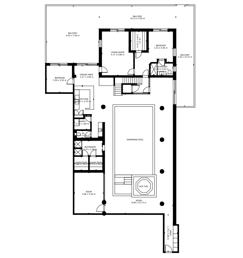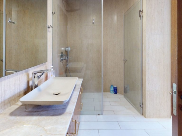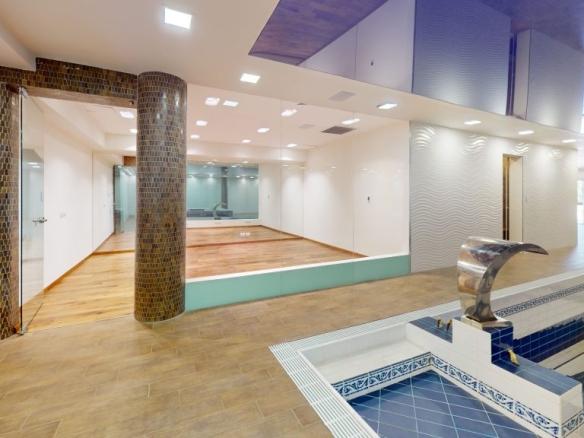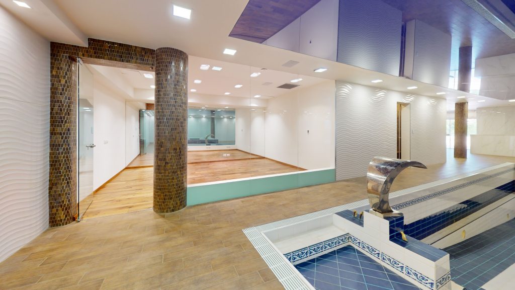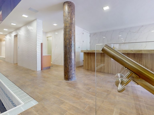 The ‘Entertainment Level’ (about 300 SQM) offers a heated pool, built-in jacuzzi, gym, wet and dry saunas, bar, treatment room, and an exit to a courtyard (123 SQM).