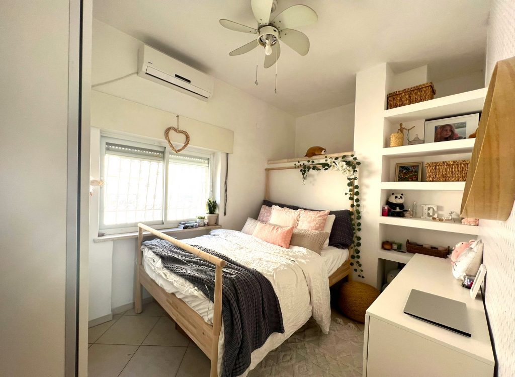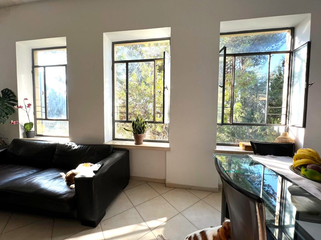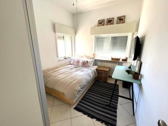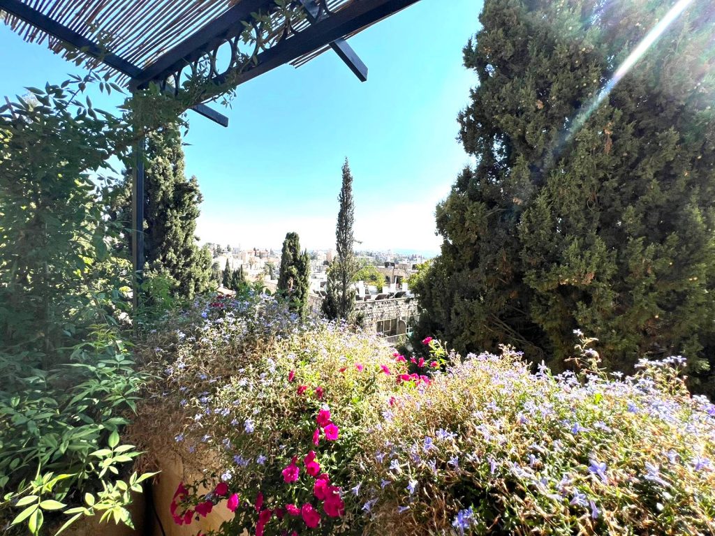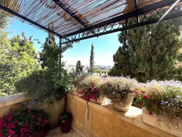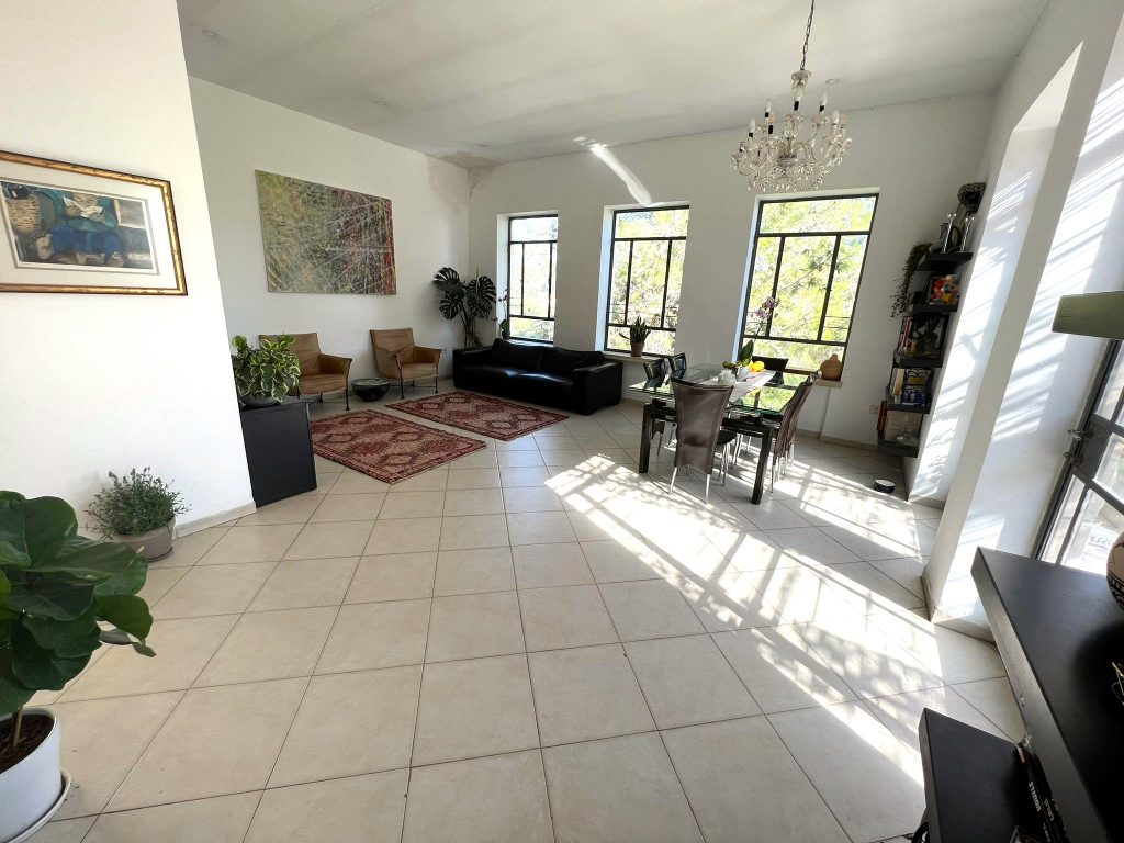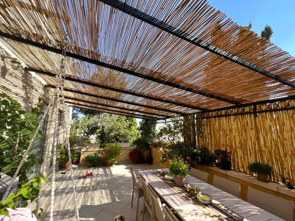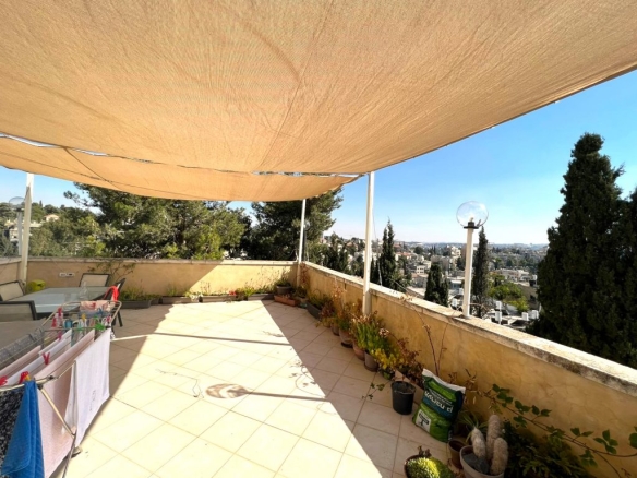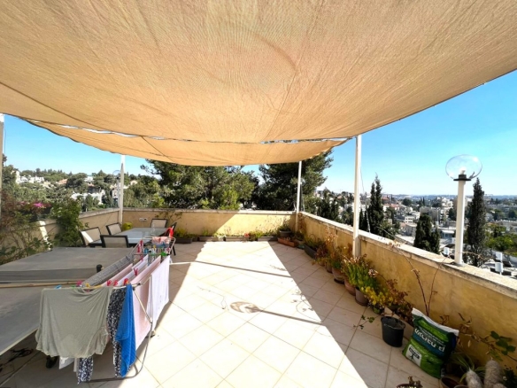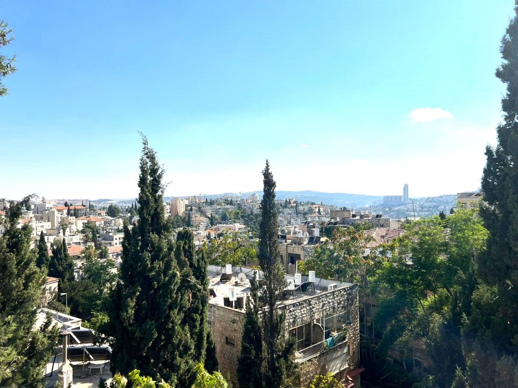 This apartment is centrally located, and very spacious. It’s an 150 sqm penthouse built on the entire top floor of a small building. The apartment has 4 bedrooms, 3 bathrooms, high ceilings, 4-direction cross-breeze, and approximately 100 sqm of balconies with beautiful Jerusalem views. The floor is approximately 220 sqm in total. In addition there is a 25 sqm unit that’s sold along with the apartment. The unit is on the edge of the building’s property, it was recently renovated and is now being rented out.